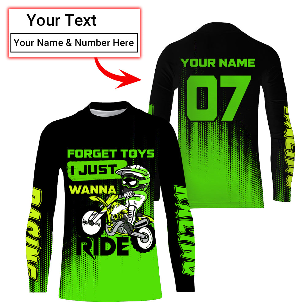 Youth Motocross Jersey UPF30+ Custom Green Dirt Bike Shirt For Boy Girl Forget Toys Just Wanna Ride PDT529