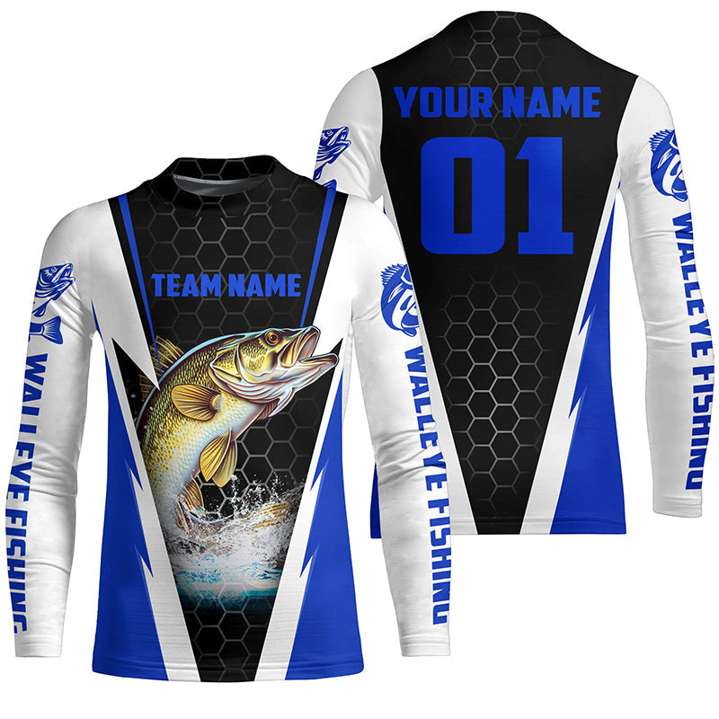 Walleye Fishing Long Sleeve Tournament Shirts For Fishing Team With Custom Name And Number | Blue IPHW6237
