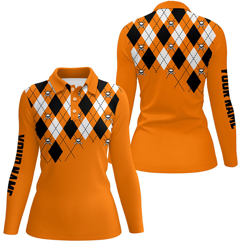 Womens golf polo shirt orange argyle plaid golf skull pattern custom ladies Halloween golf tops NQS6196