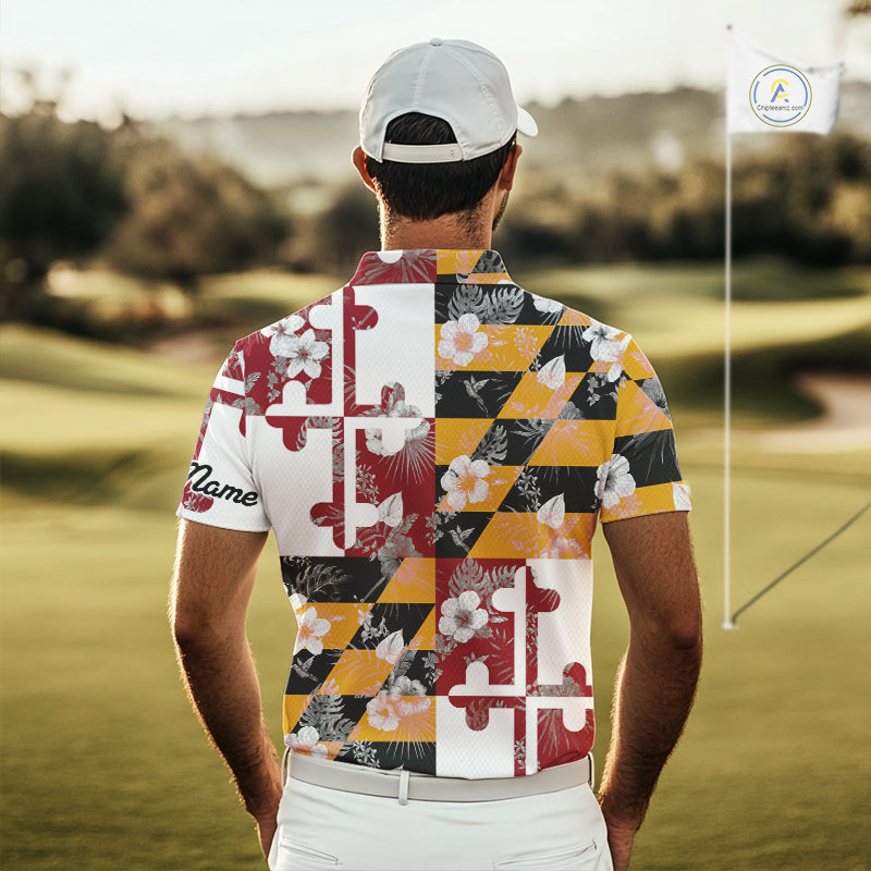 Maryland Flag tropical flower pattern Mens Golf polo shirts Custom mens patriotic golf shirts NQS10064