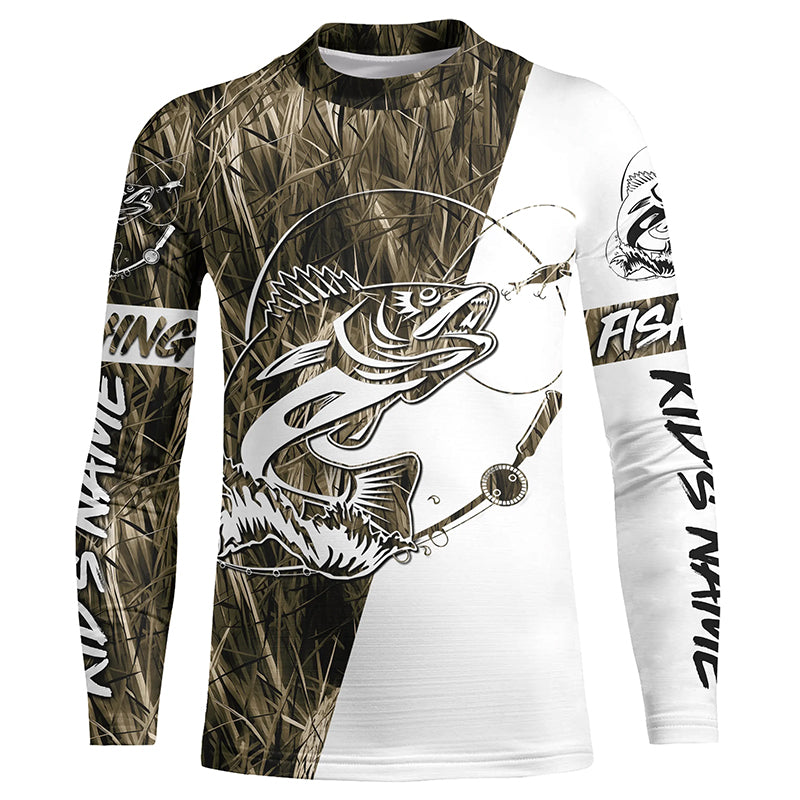 Walleye Fishing Grass Camo Custom Long Sleeve Fishing Shirts, Walleye Tournament Fishing Jerseys IPHW5775