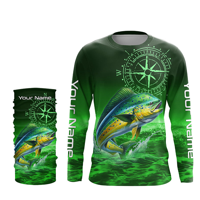 Personalized Mahi mahi Green Long Sleeve Performance Fishing Shirts, Dorado compass tournament Shirts NQS5951