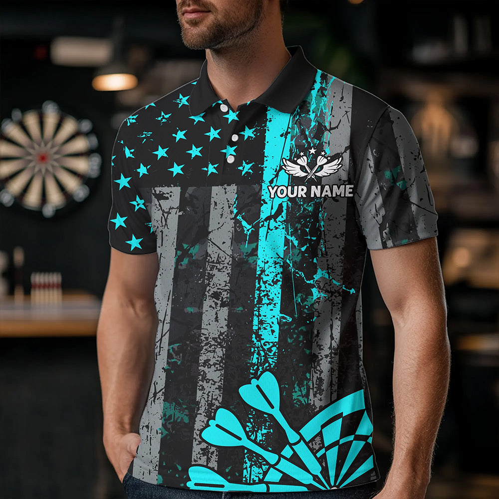 Custom Turquoise Grunge Us Flag Patriotic Darts Shirt For Men, Retro Darts Board Darts Team Jerseys TDM1648