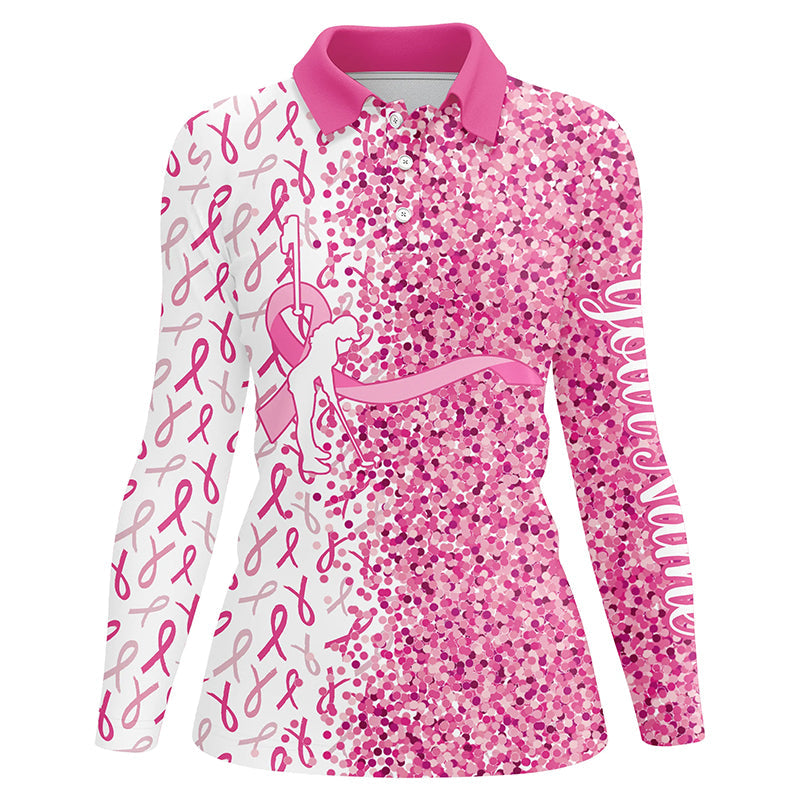 Pink glitter ribbon Womens golf polo shirt custom breast cancer golf shirt for ladies, gift for golfer NQS8106