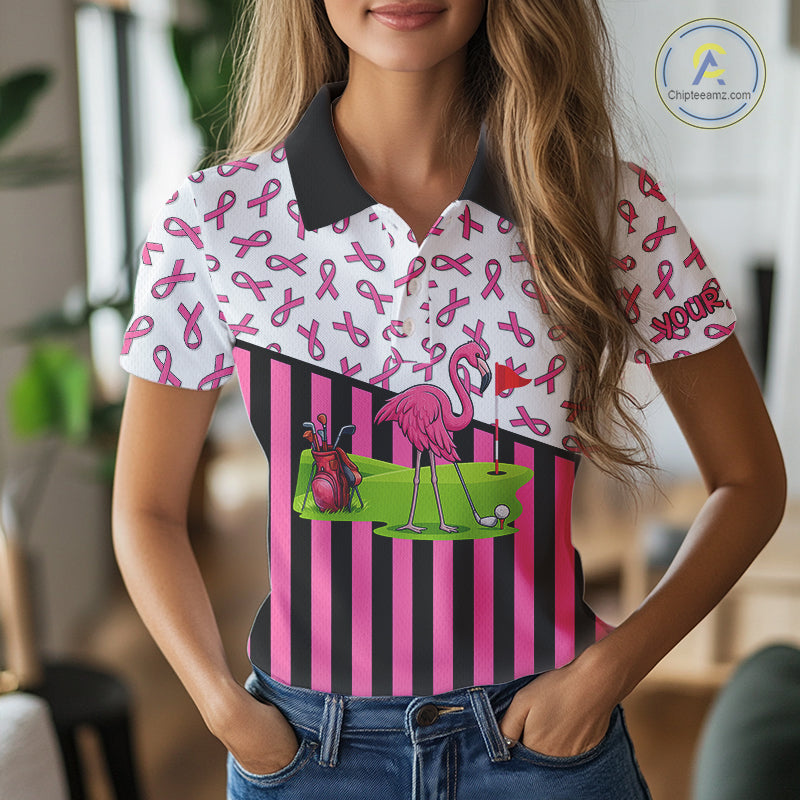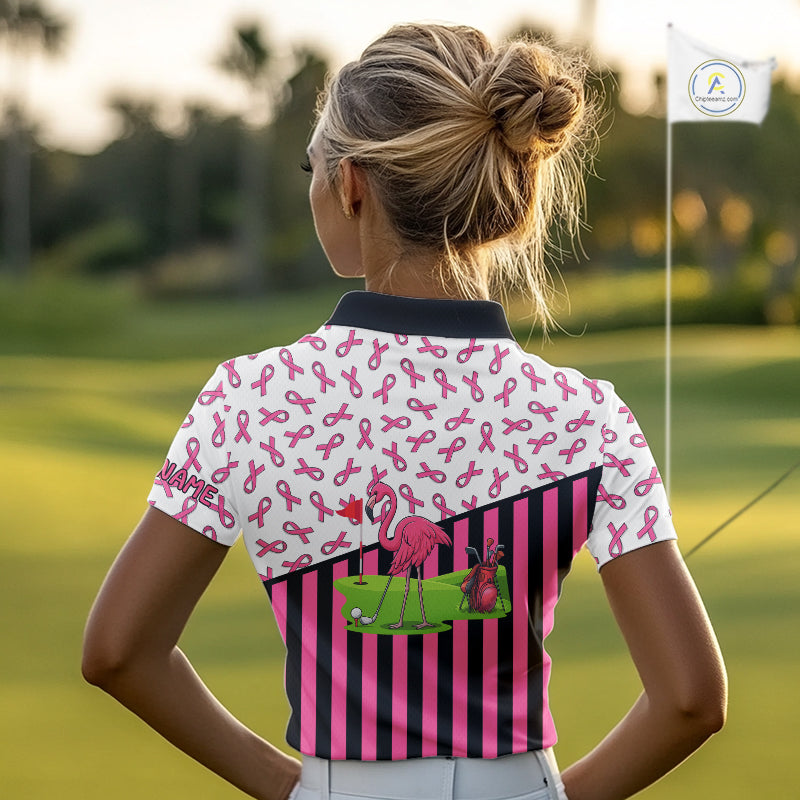 Pink ribbon pattern flamingo Women golf polo shirts Custom breast cancer awareness ladies golf outfit NQS10149