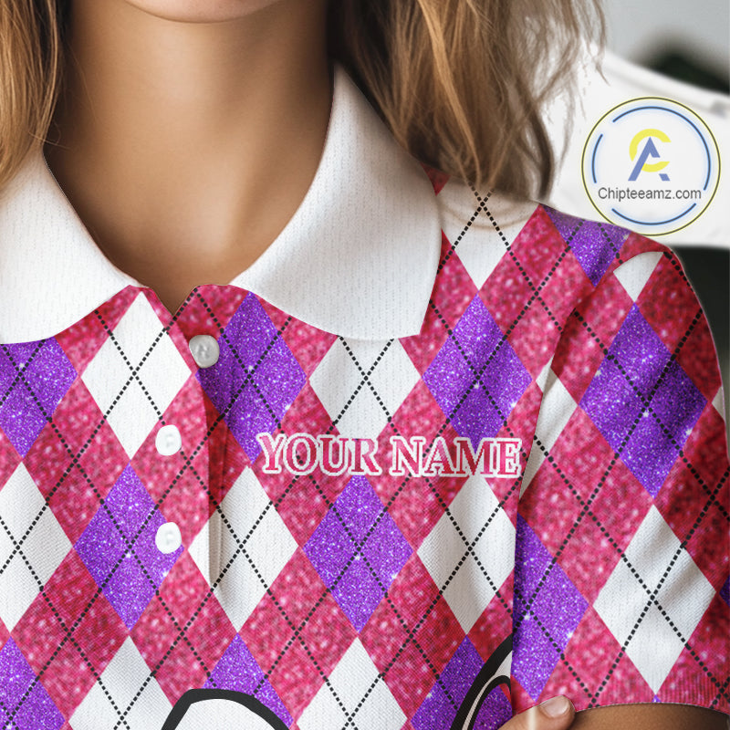 Pink purple glitter argyle pattern Flamingo Women golf polo shirt Custom weekend forecast golf & wine NQS10325