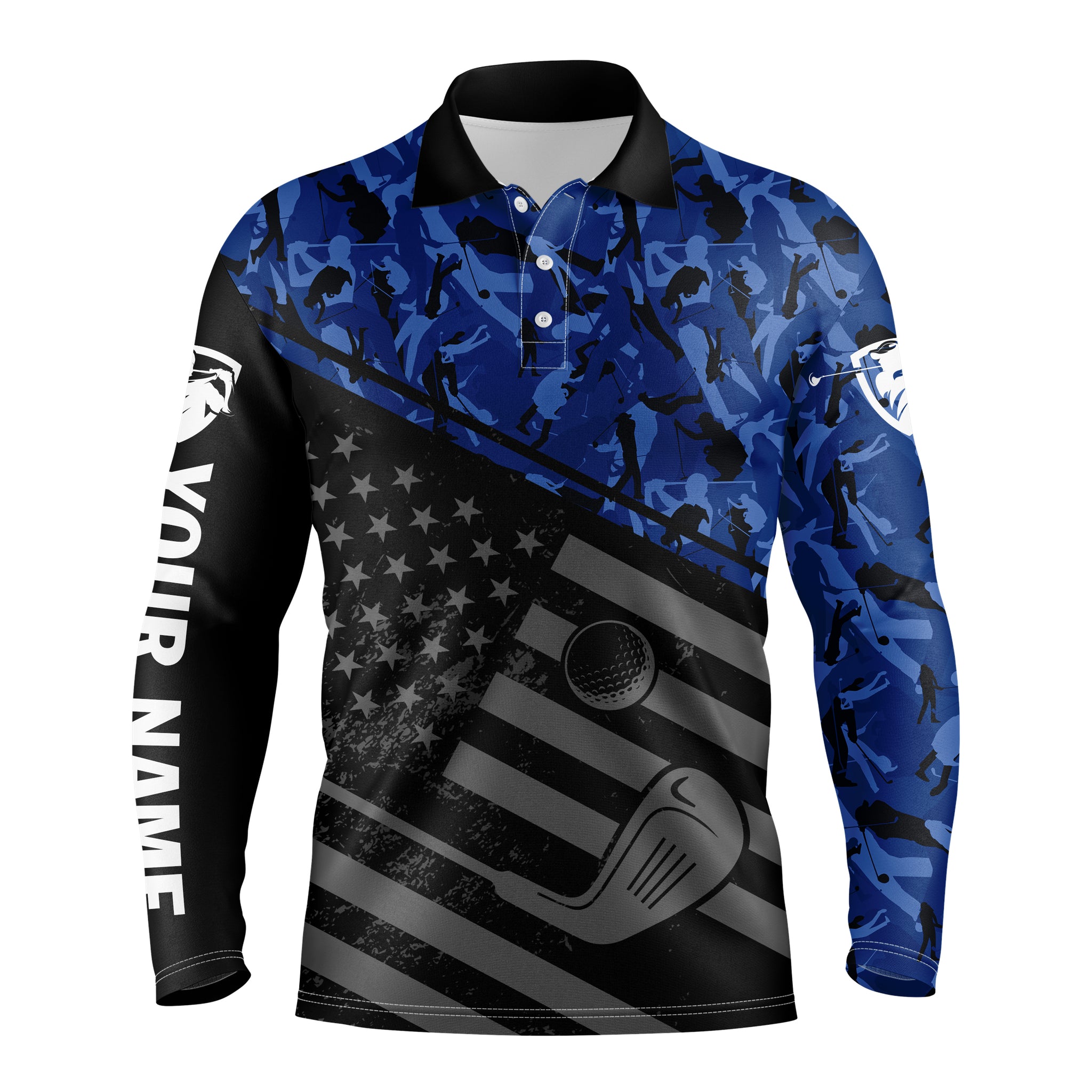 Mens golf polo shirt black American flag patriotic blue camo polo custom name golfing gifts NQS3436