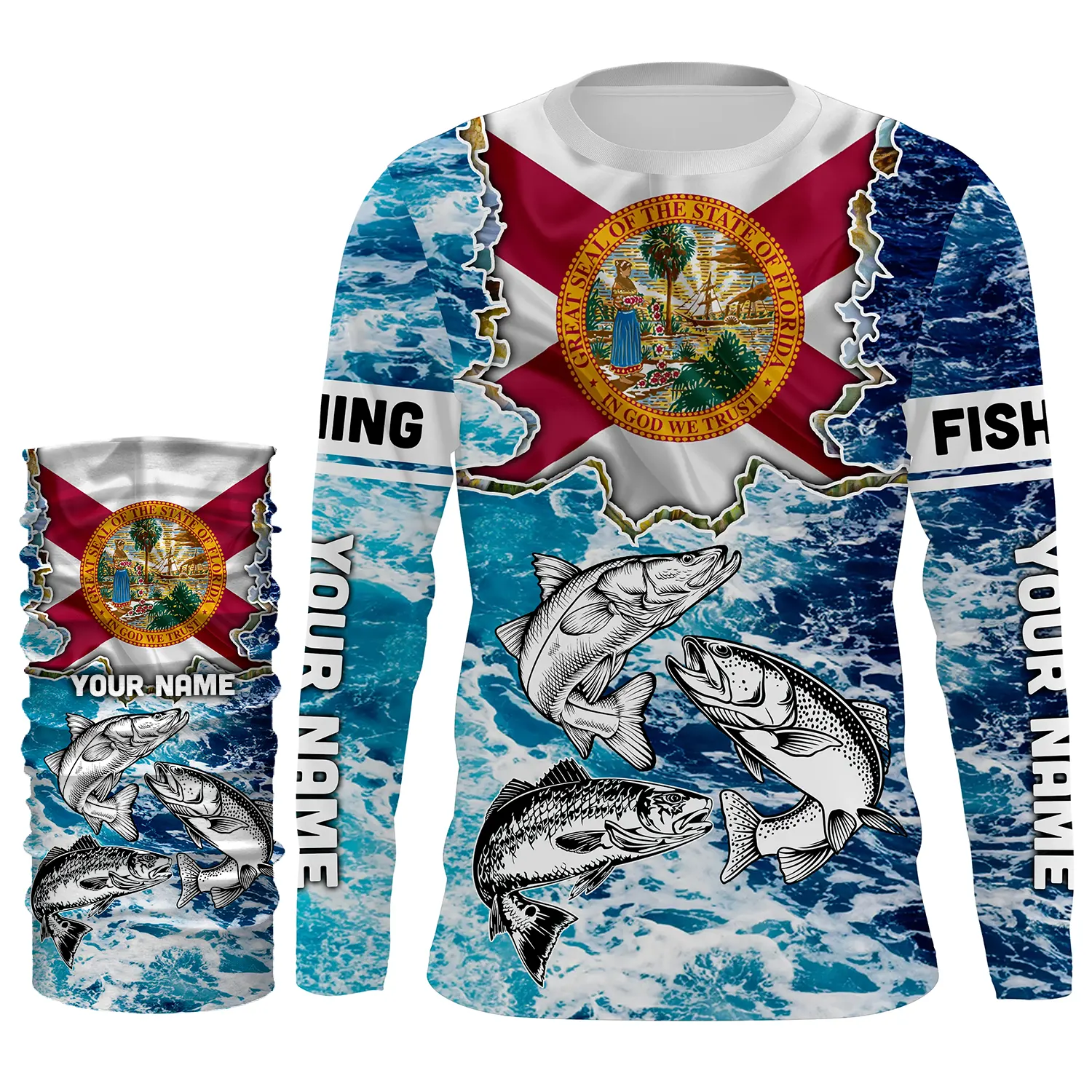 Florida Flag Redfish, trout, snook blue wave camo custom performance long sleeve fishing shirts NQS4771