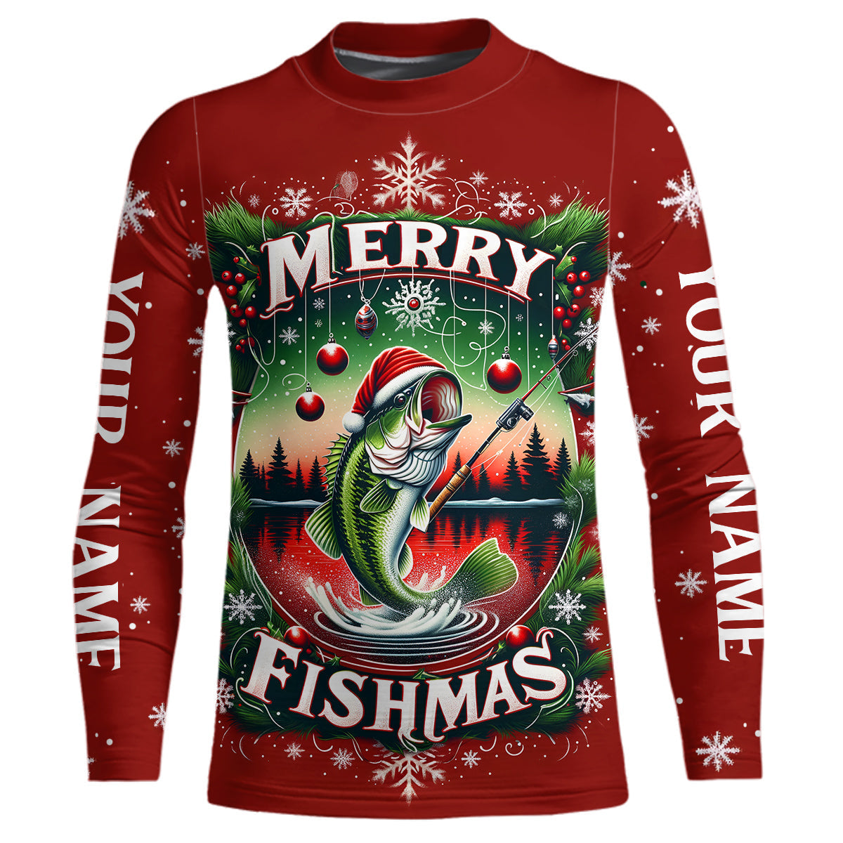Merry Fishmas Custom Christmas Bass Full Printing Fishing Shirts Fishing Gifts For Adult And Kid IPHW5553