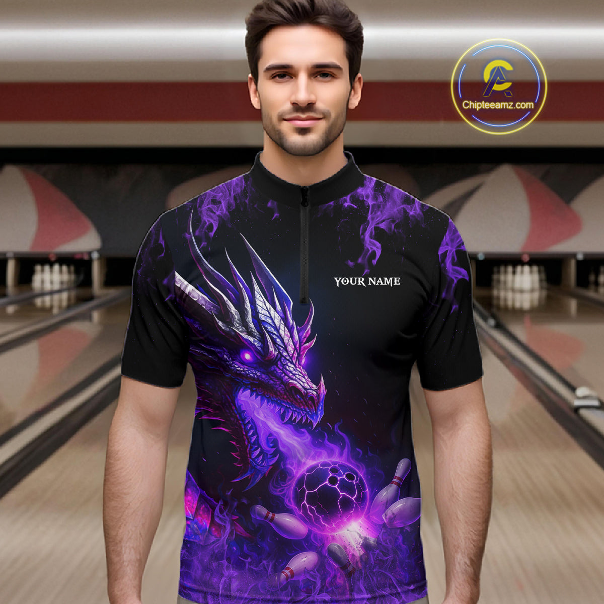 Black and Purple Flame Dragon Bowling Polo, 1/4 Zip Shirts For Men Custom Dragon Bowling Team Jerseys NQS11211