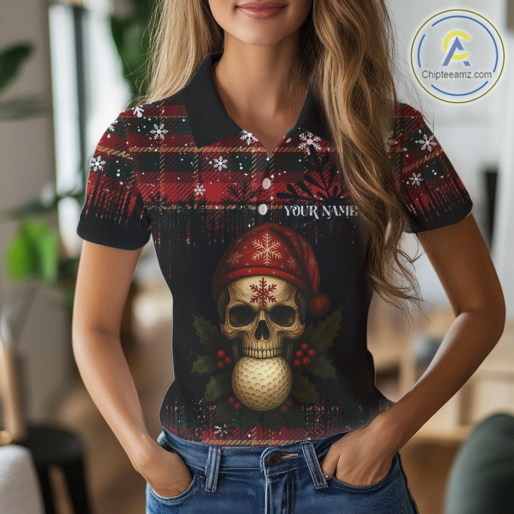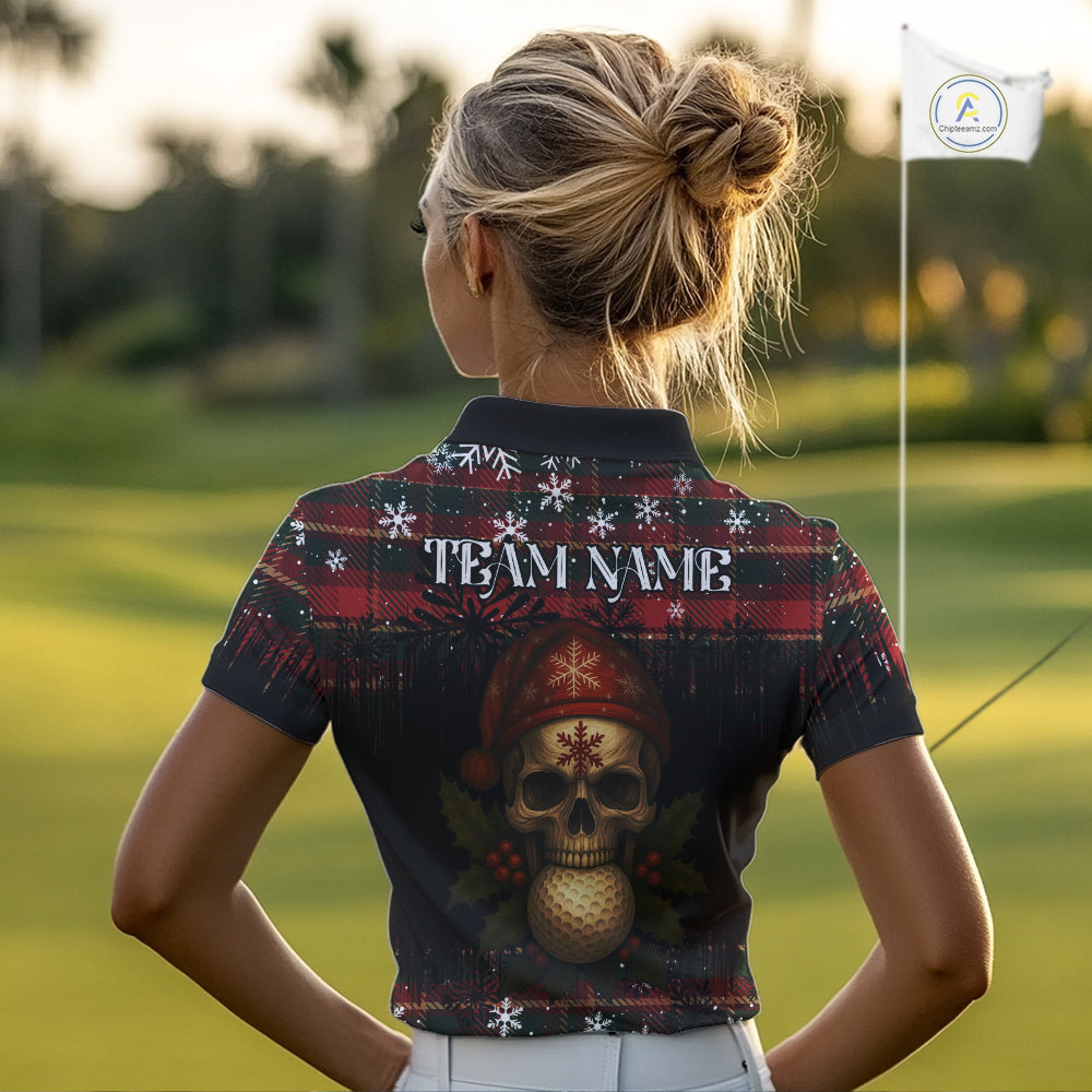 Black and Red Plaid Christmas pattern Skull Women Polo Shirt Custom Ladies Golf outfit, golfing gifts NQS11058