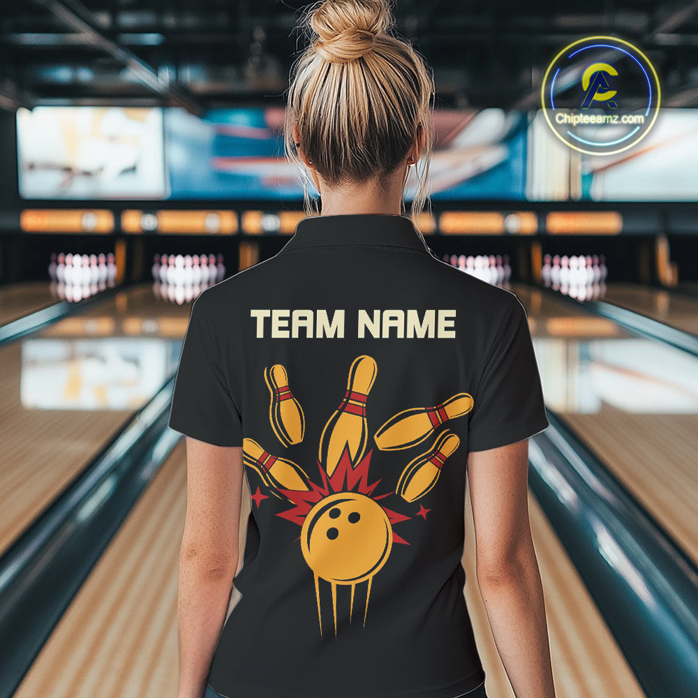 Black and Yellow Retro Bowling Polo, Quarter Zip shirt for Women Custom vintage team bowling jersey NQS10707