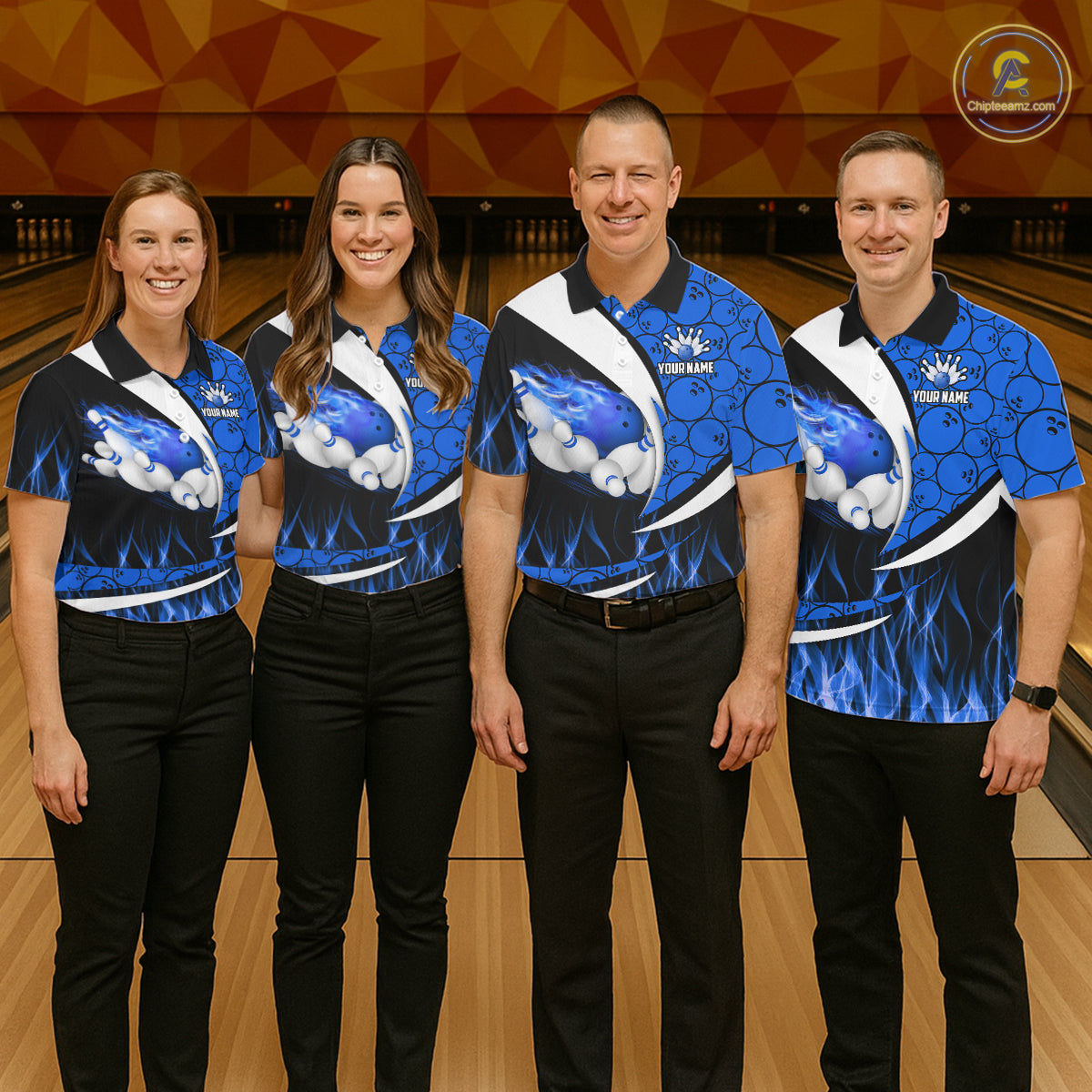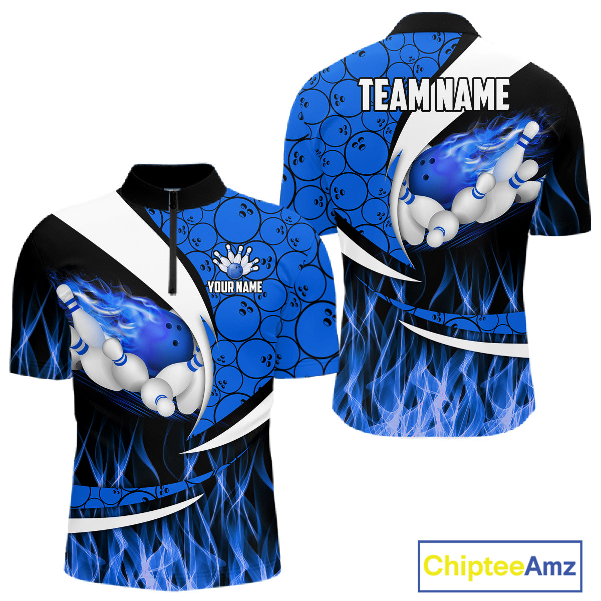 Blue Flame Bowling Camo Bowling Polo, Quarter Zip Shirts For Men Custom Bowling Team Bowler Jerseys NQS11195