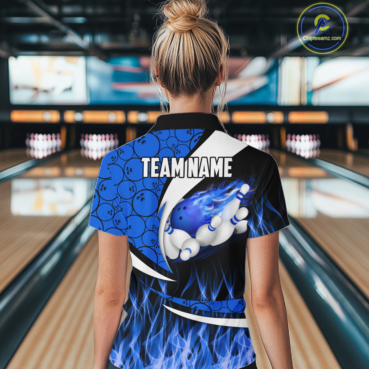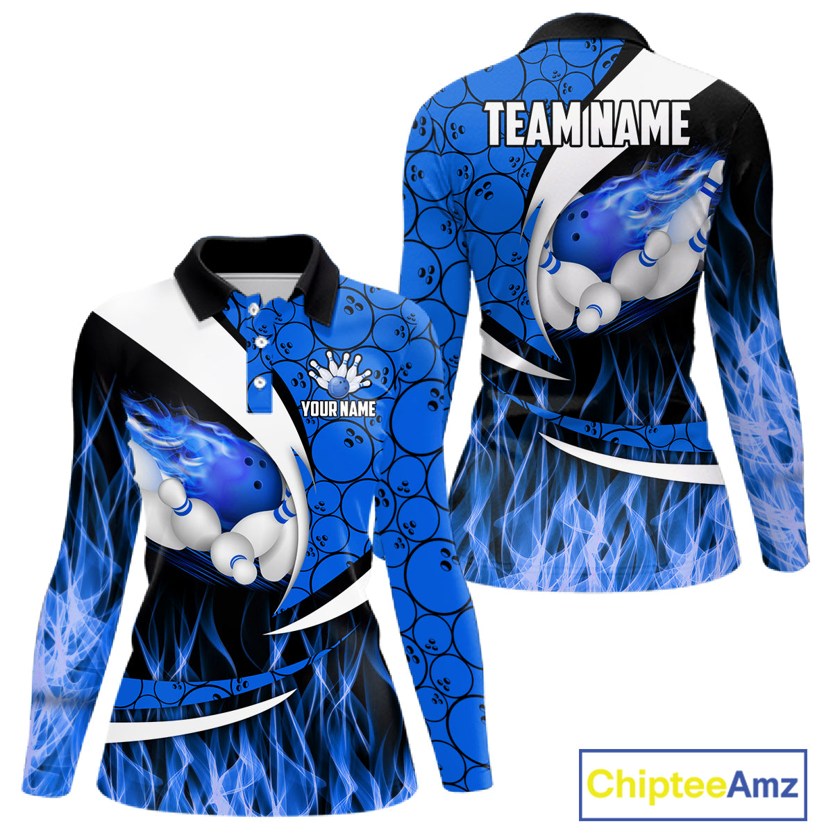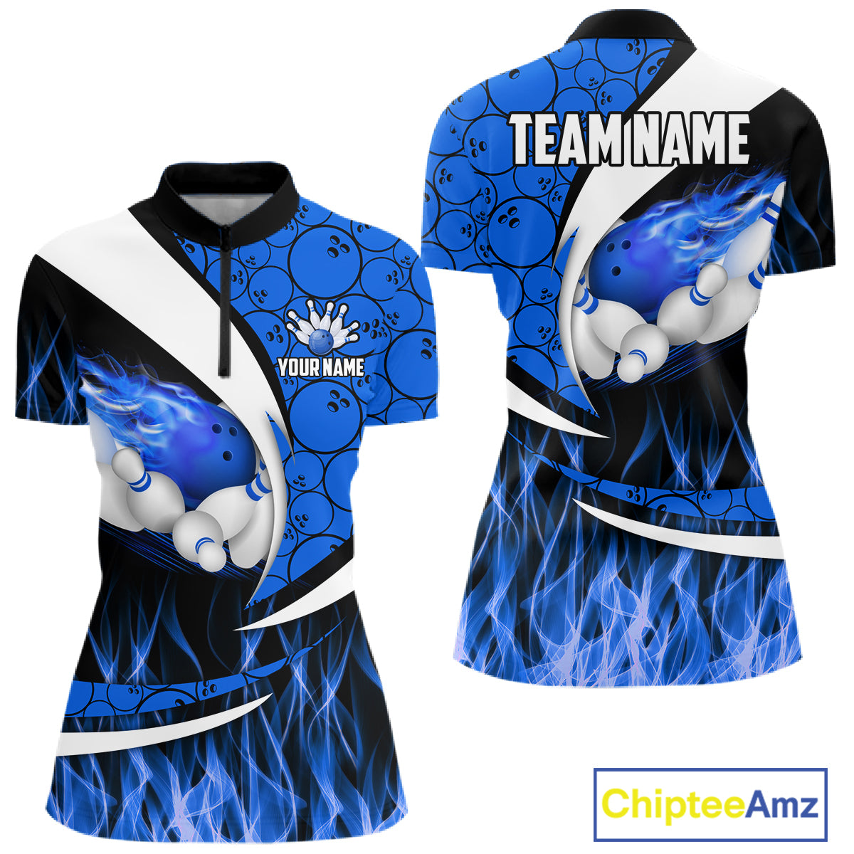Blue Flame Bowling Camo Bowling Polo, Quarter Zip Shirts For Women Custom Bowling Team Bowler Jerseys NQS11195