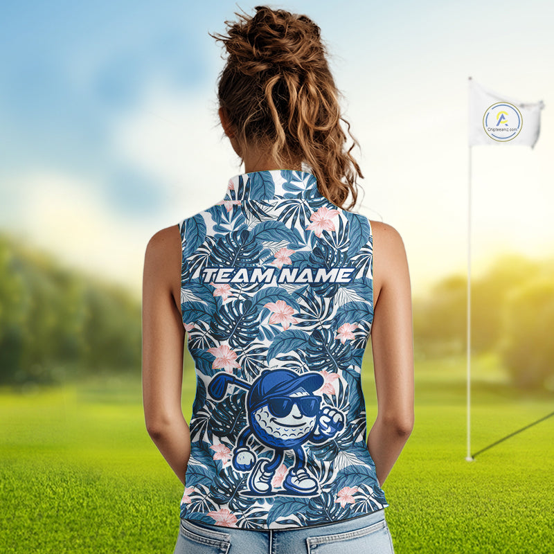Blue tropical leaf pattern pink flower funny Sleeveless Golf polo shirts Custom ladies golf outfits NQS10119