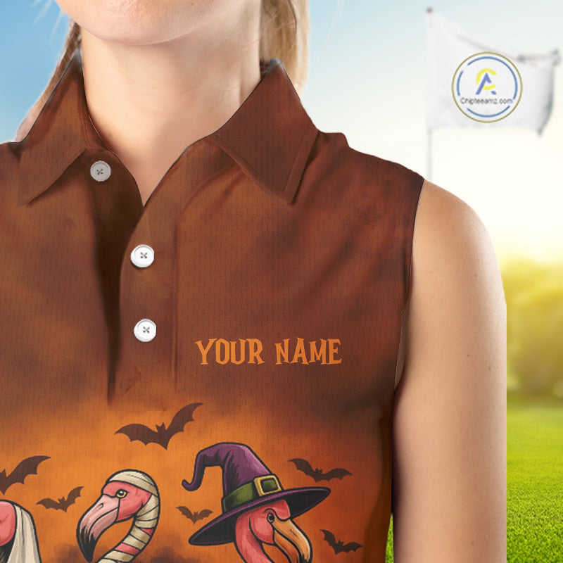 Funny Flamingo Pumpkin Sleeveless Golf Polo Shirt For Women Custom Halloween Golf Tops | Orange NQS10702