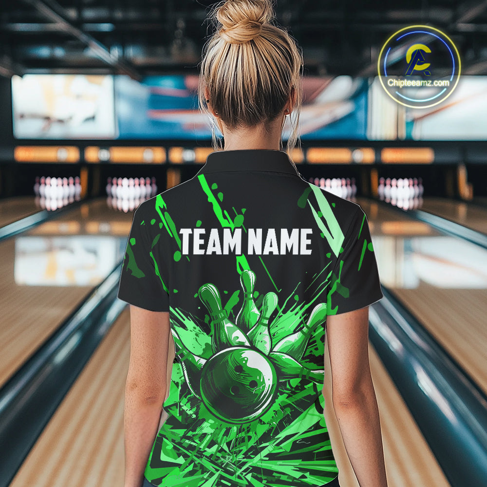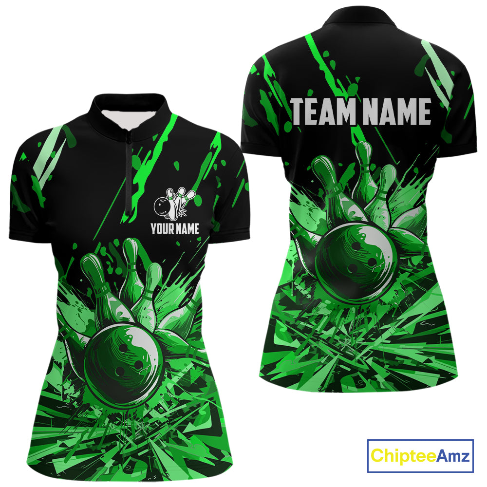 Green bowling jerseys Bowling Polo, 1/4 Zip Shirt for Women Custom Bowling Team shirts for bowlers NQS11084