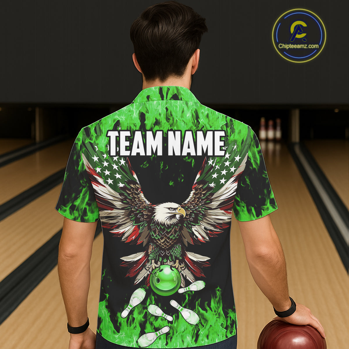 Green flame Hawaiian bowling shirts Custom American flag Eagle Team bowling shirts, gift for bowlers NQS11188
