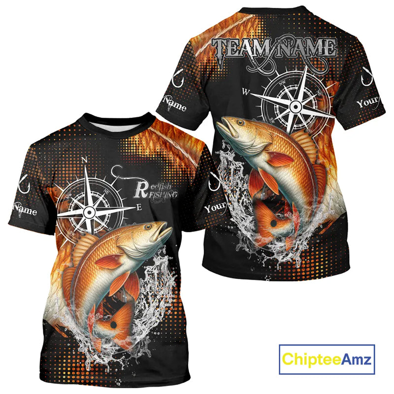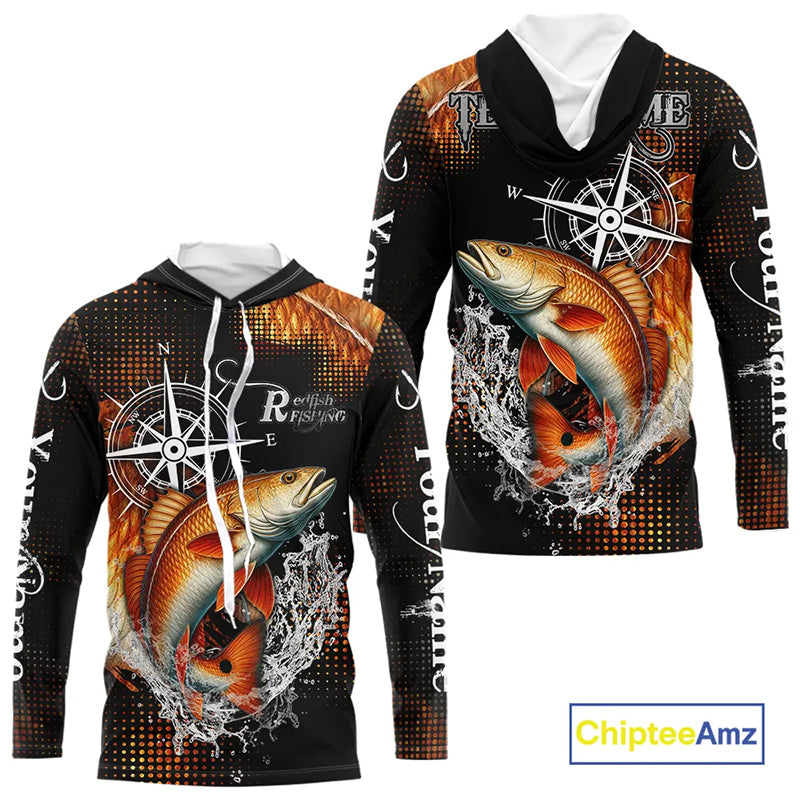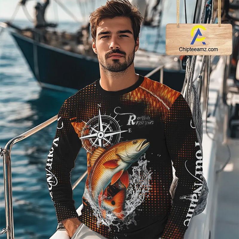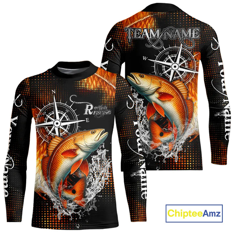Personalized Black and Red Redfish fishing scales compass Performance long sleeve Fishing Team Shirts NQS11217