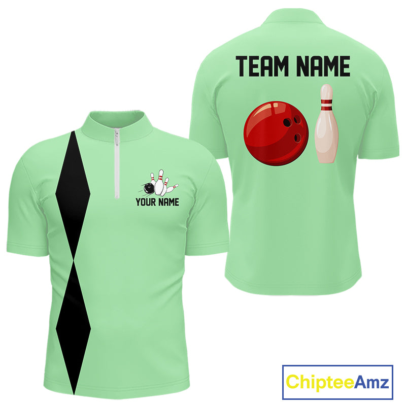 Personalized Retro Bowling Polo, 1/4 Zip Shirt For Men custom vintage bowling team jersey| Mint Green NQS11018