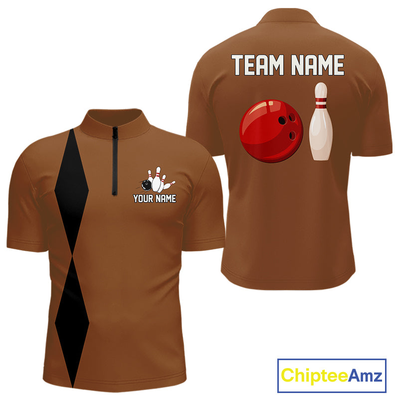 Personalized Retro Bowling Polo, 1/4 Zip Shirts For Men custom vintage bowling team jersey | Brown NQS11016
