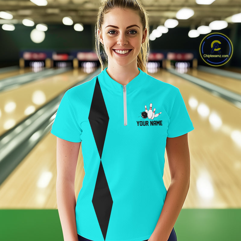 Personalized Retro Women Bowling Polo, 1/4 Zip Shirts custom vintage bowling team jersey | Cyan Blue NQS11017