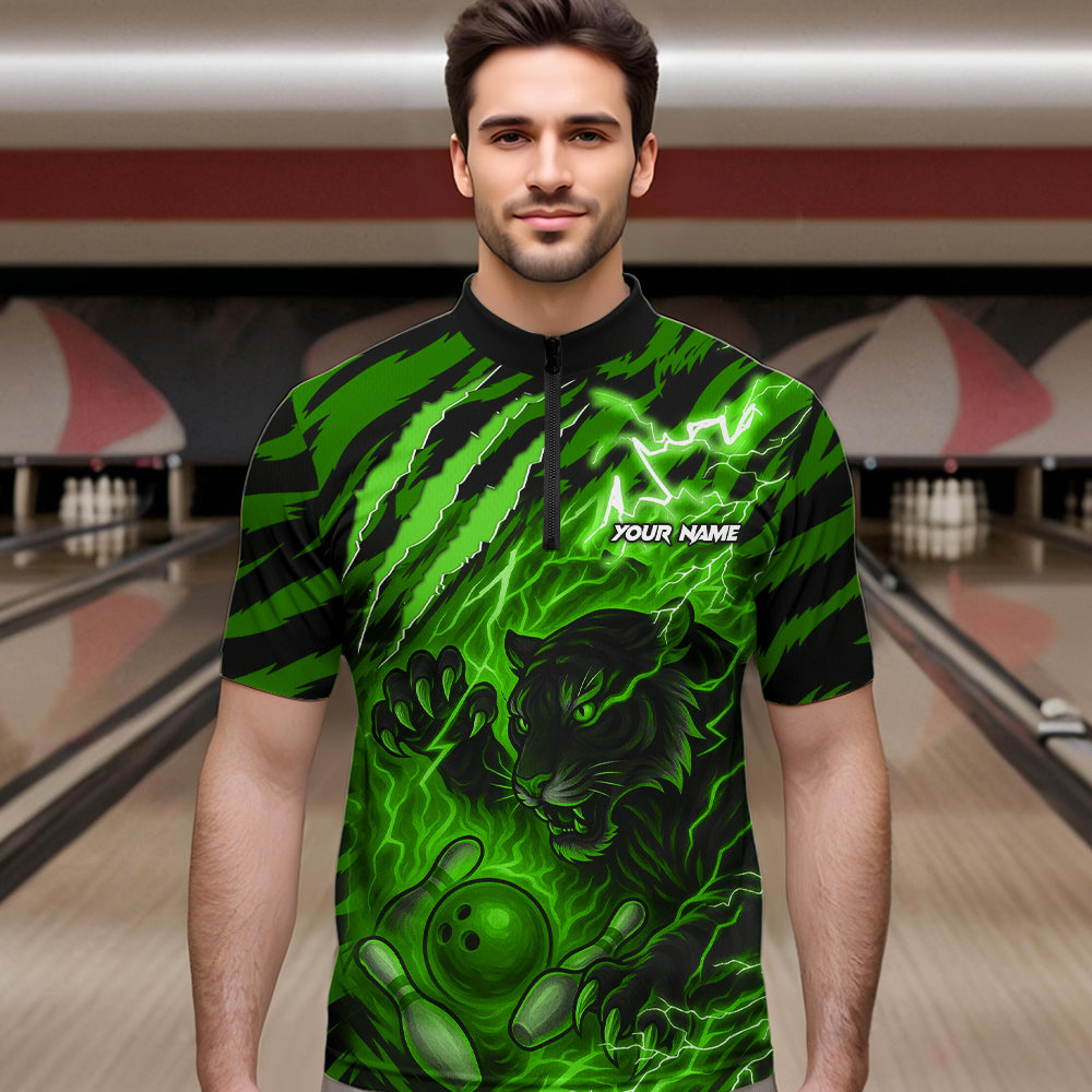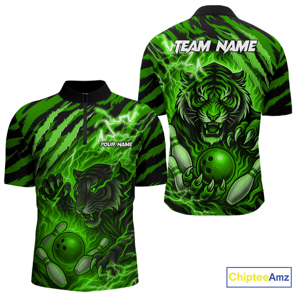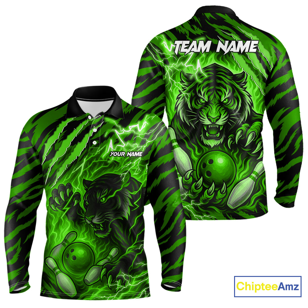 Personalized Tiger Bowling Shirts For Men, Green Flame Lightning Thunder Tiger Team Bowling Jerseys NQS11233