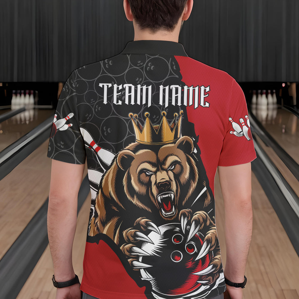 Black And Red Custom Bear Bowling King Polo Shirts For Men, Bear Bowling Team Uniform IPHW8834