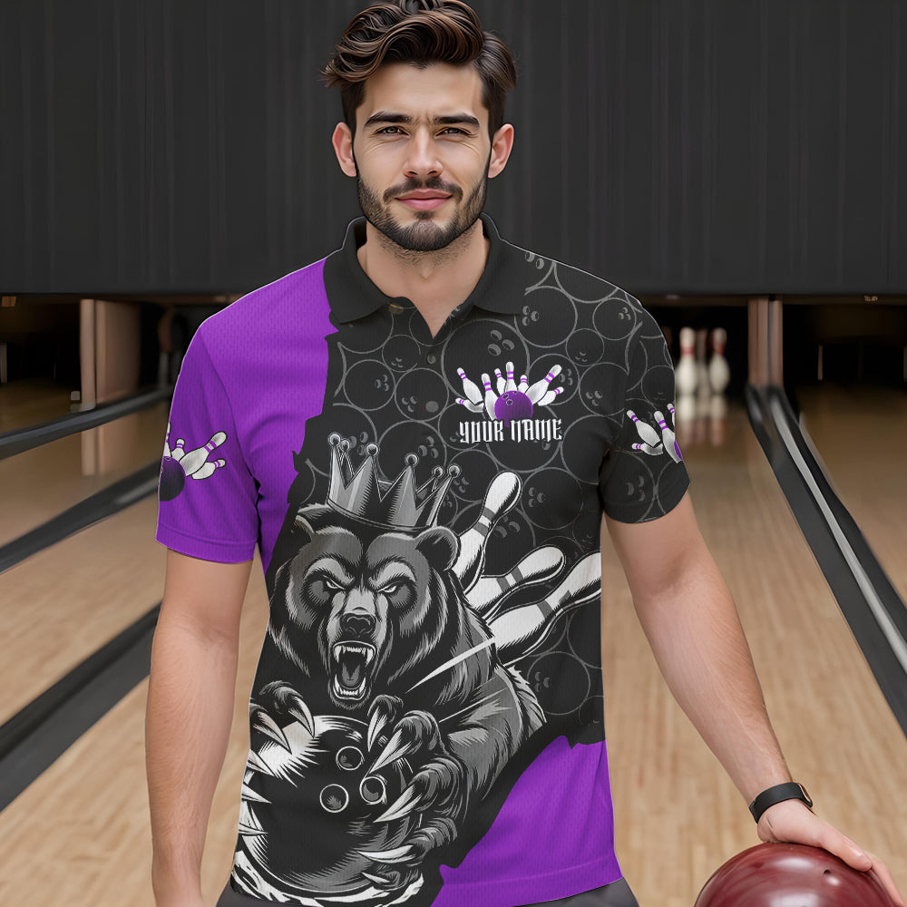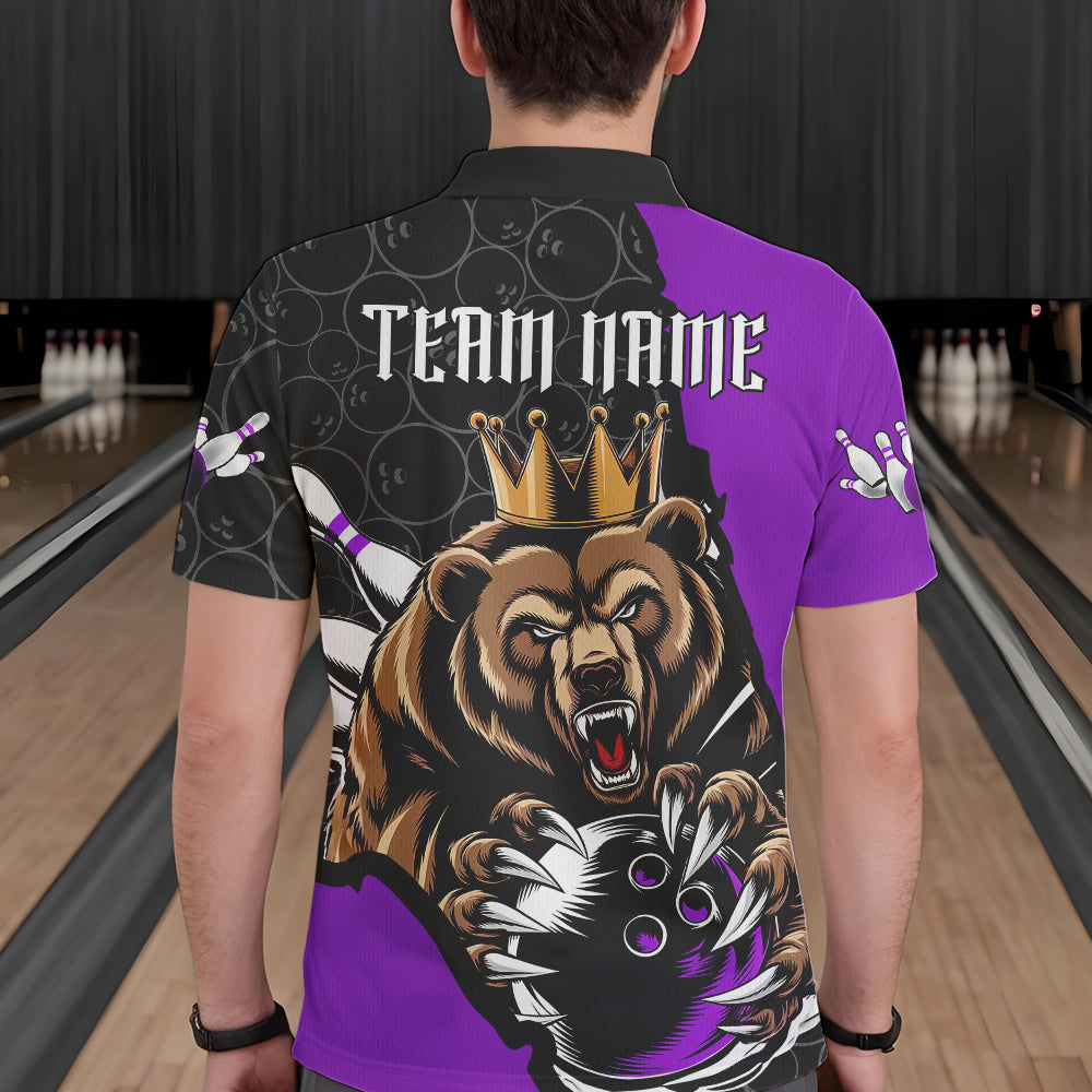 Black And Purple Custom Bear Bowling King Polo Shirts For Men, Bear Bowling Team Uniform IPHW8836