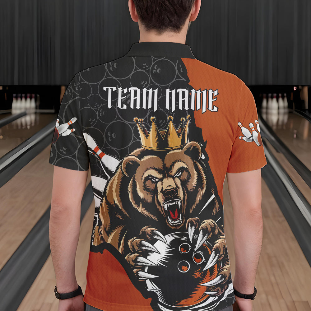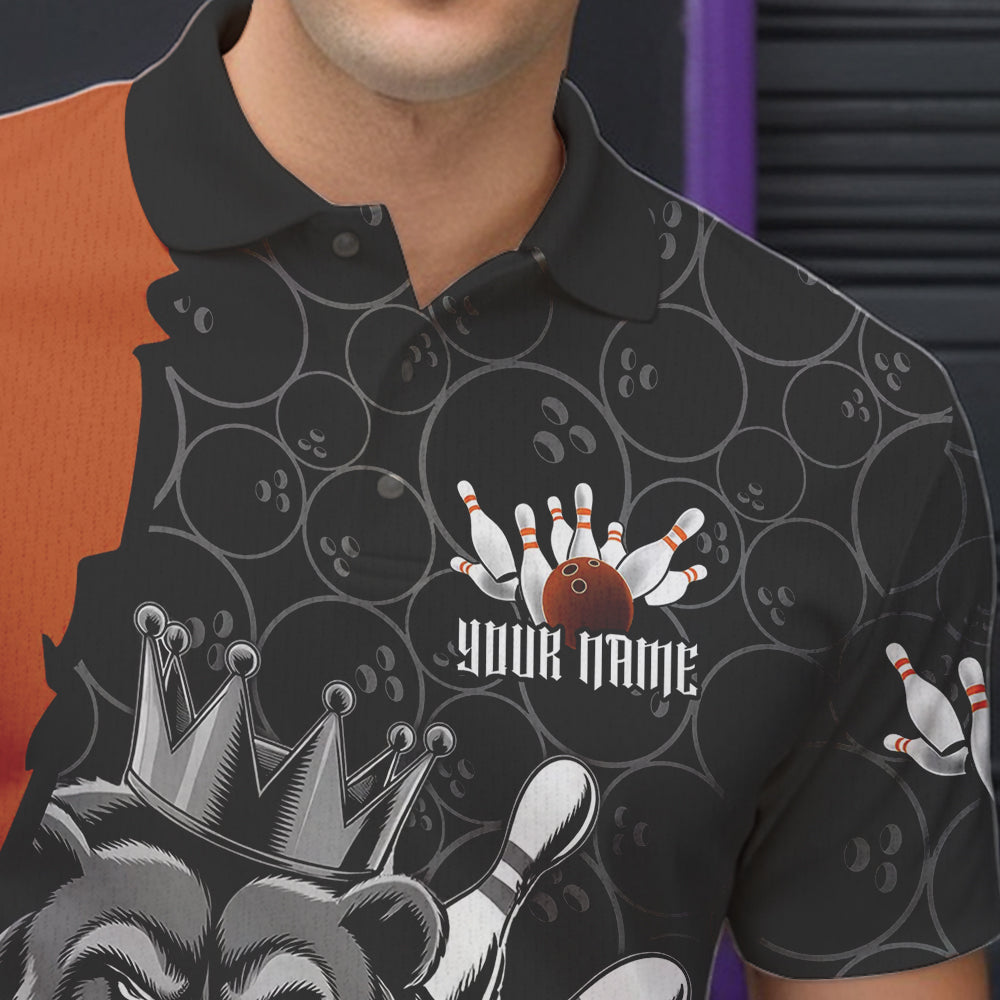 Black And Orange Custom Bear Bowling King Polo Shirts For Men, Bear Bowling Team Uniform IPHW8837