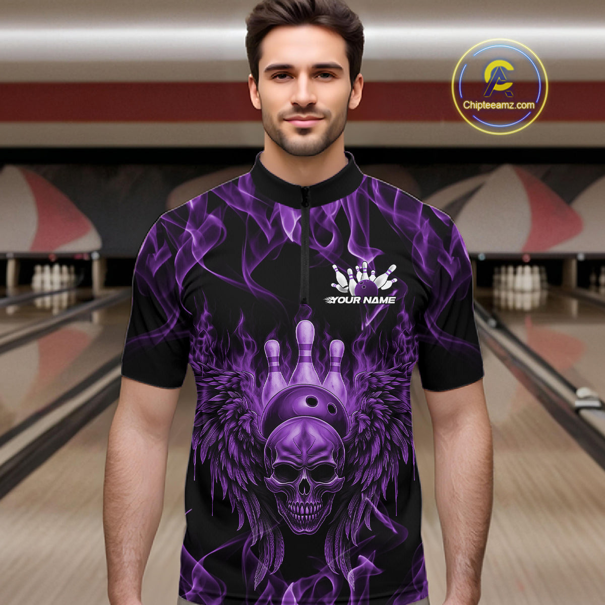Custom Black And Purple  Flame Skull With Wings Men Bowling Shirt, Halloween Team Shirt IPHW10168