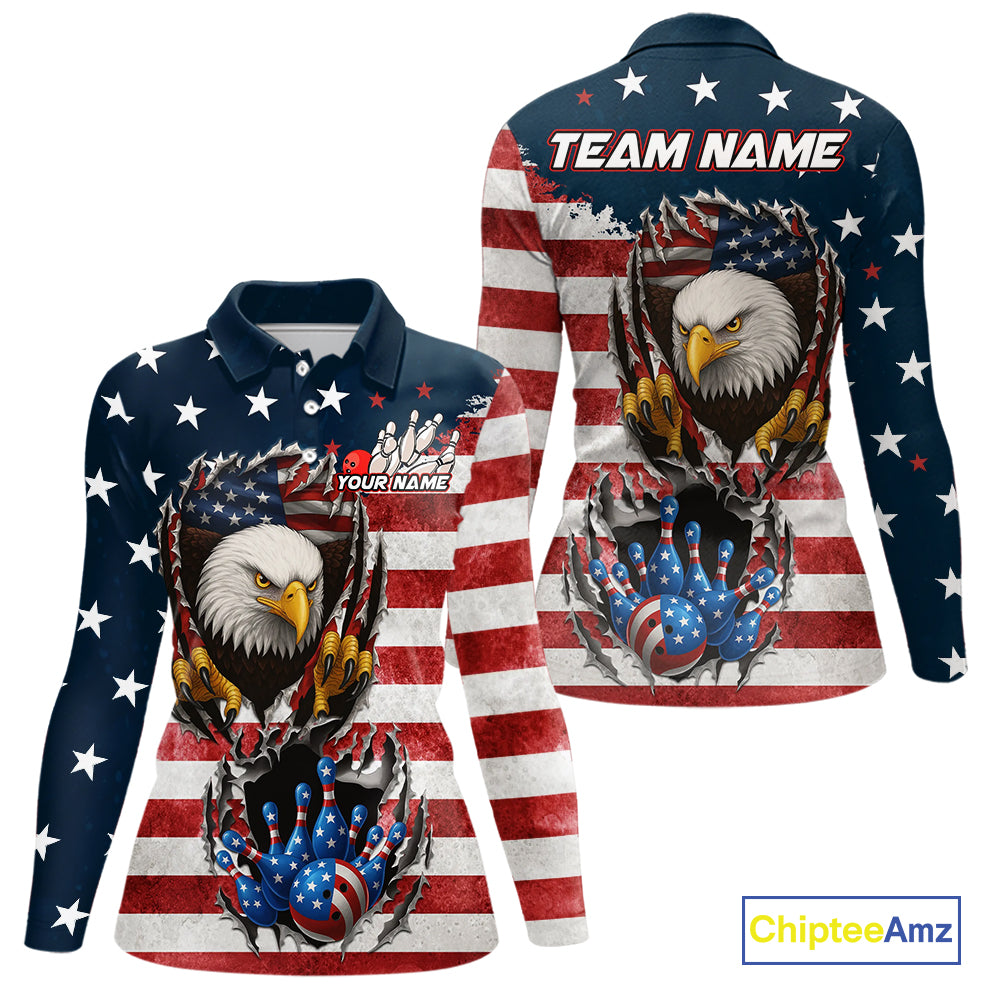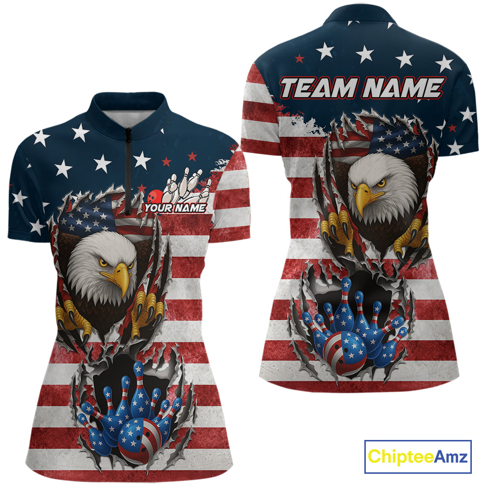 Vintage American Flag Eagle Bowling Polo,1/4 Zip Shirt for Women Custom Patriotic Team Bowling Jersey NQS10569