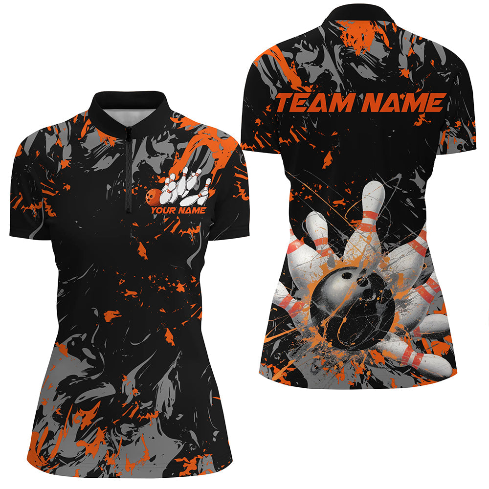 Black And Orange Splatter Bowling Shirts For Women, Bowling Team Uniform Bowler Outfit IPHW7984