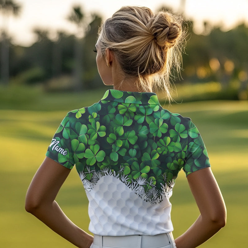 Womens golf polo shirts custom Green clover golf pattern white St Patrick Day golf attire for ladies NQS9473